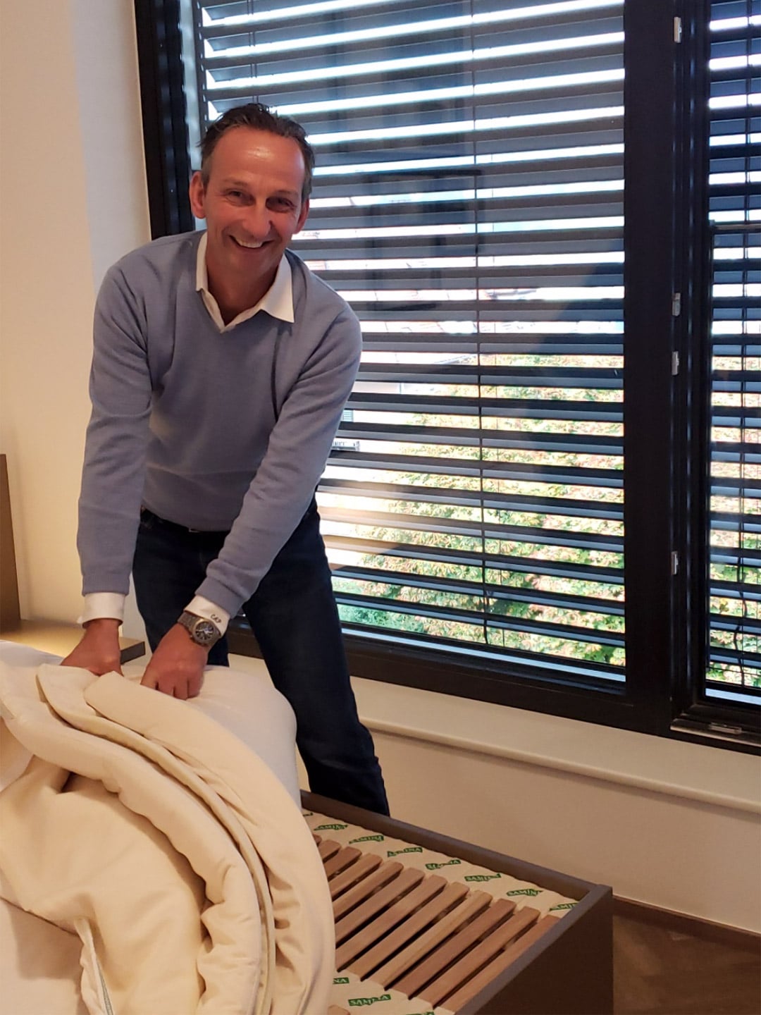 Claus Pummer of SAMINA Sleep in the USA inspects the SAMINA sleep system at the Saminapark Aparthotel in Frastanz, Austria, the birthplace of SAMINA.