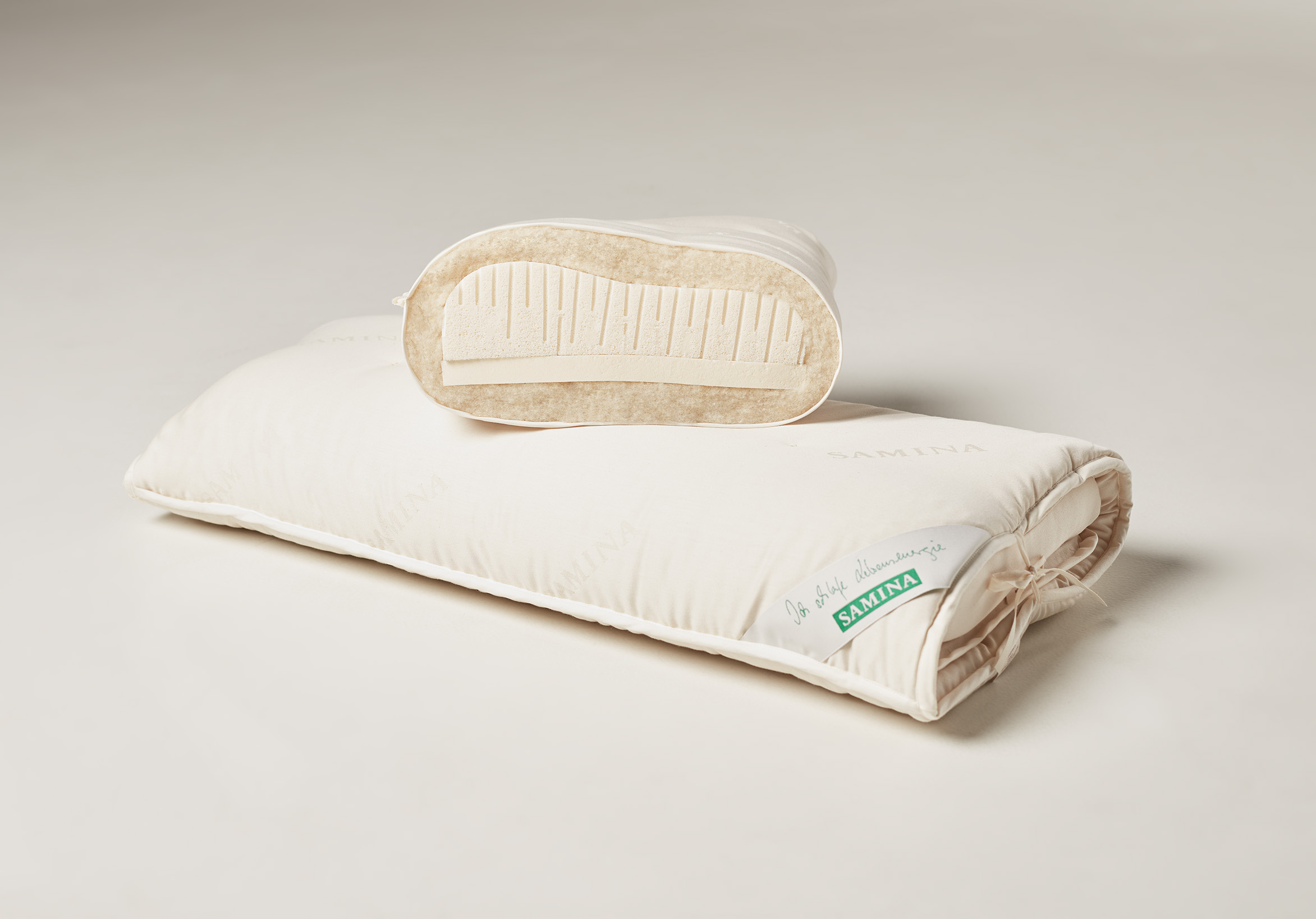 The design of all SAMINA pillows included input from orthopedic physicians ensuring proper adaptation to the neck and head. The Delta pillow core is made of natural rubber and orthopedically shaped to optimally relieve the head, neck, and shoulder joint in every sleeping position.